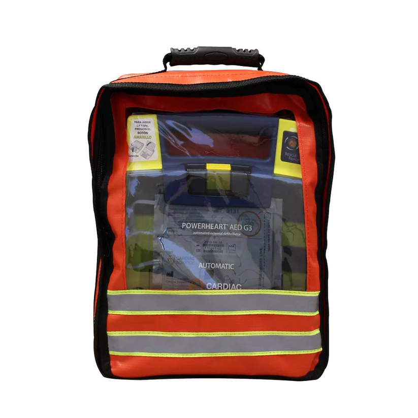 Mochila de emergencia alta visibilidad para día y noche gracias a sus cintas reflectivas, totalmente acolchada con material impermeable en caso de salpicaduras de agua, tapa transparente para identificar el contenido, Sujeción para pecho y cintura regulables. Con asa de mano y dos asas acolchadas en la espalda y dos compartimiento interior, apertura con cremallera y dos hebillas metálicas resistentes ubicada en la parte trasera apta para colgar.